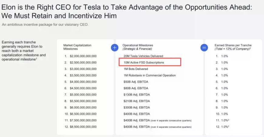 根据特斯拉的股东委托书,马斯克的薪酬方案共有四个产品目标,其中第二项就是:“实现1000万个活跃FSD订阅”。