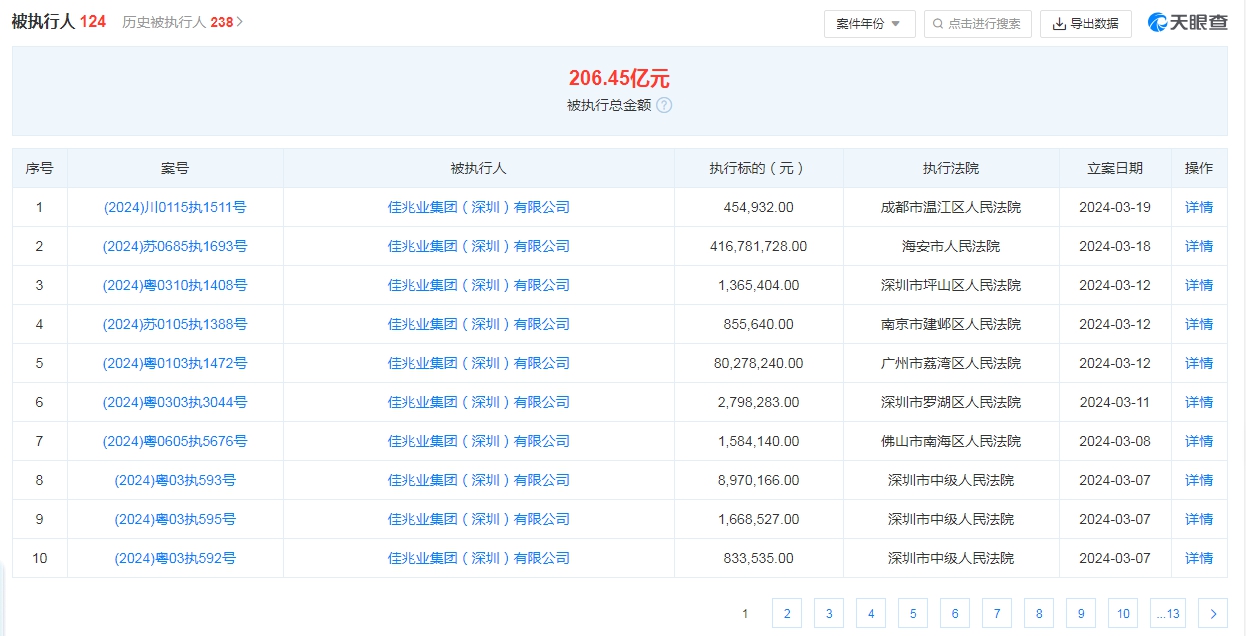 天眼查APP显示,佳兆业集团(深圳)有限公司现存124条被执行人信息,被执行总金额超206亿元。此外还存在多条限制消费令、失信被执行人(老赖)和终本案件信息。