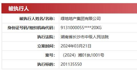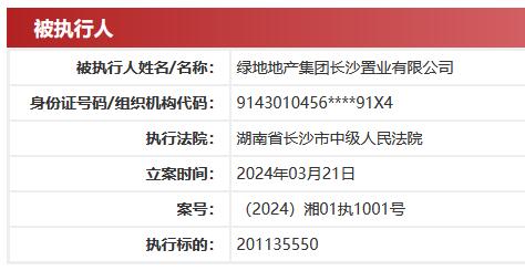 燃点网3月25日电 中国执行信息公开网显示,绿地地产集团有限公司(下称“绿地地产”)、绿地地产集团长沙置业有限公司(下称“绿地地产长沙置业”)近日新增一则被执行人信息,执行标的201135550,执行法院为湖南省长沙市中级人民法院,立案时间为2024年3月21日。