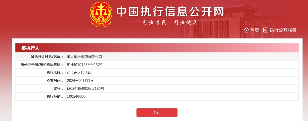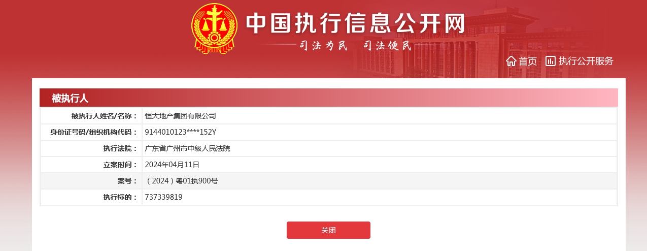 具体来看,4月11日,恒大地产被伊宁市人民法院执行100240000元,被广东省广州市中级人民法院执行737339819元。