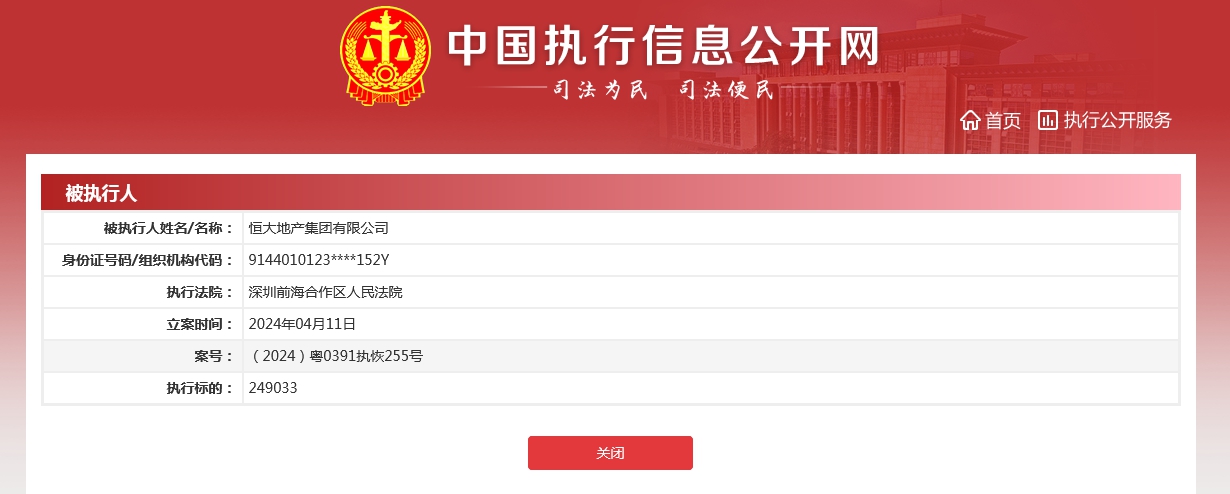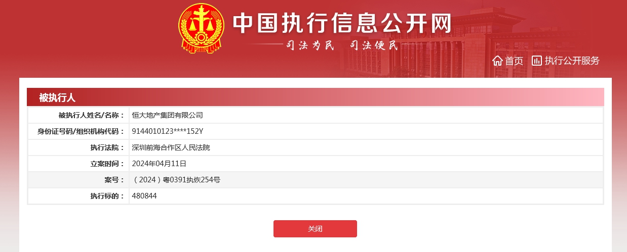 燃点网4月12日电 中国执行信息公开网显示,4月11日,恒大地产集团有限公司(下称恒大地产)新增2条被执行人信息,执行标的约8.38亿元,另被恢复4则被执行人信息。