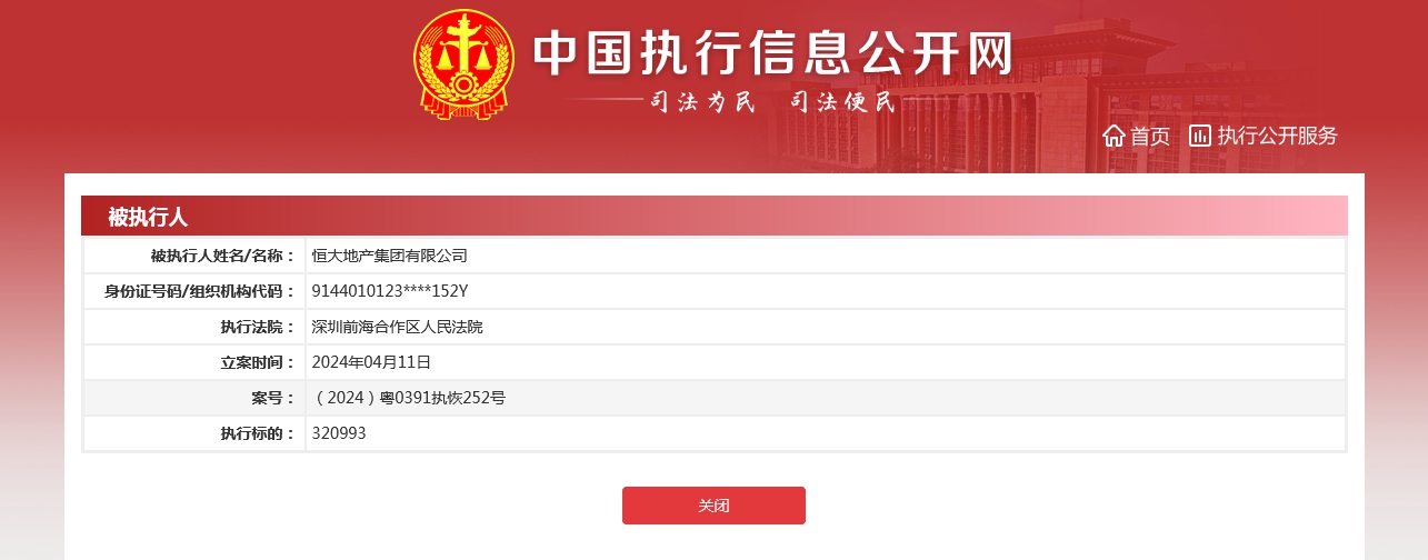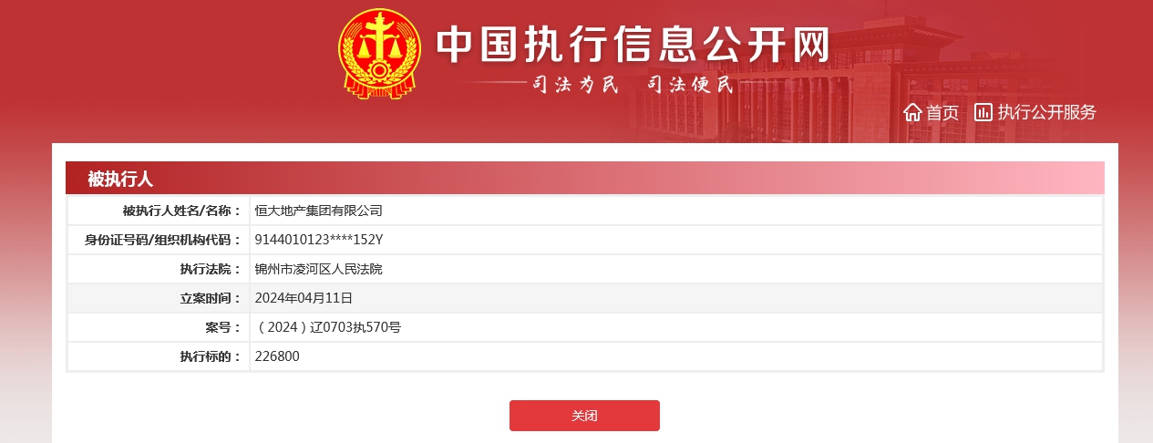 此外,恒大地产4月11日被深圳前海合作区人民法院分别恢复执行249033元、320993元、480844元,被锦州市凌河区人民法院恢复执行226800元。