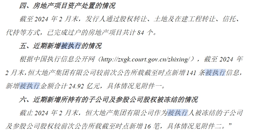 恒大地产4月2日披露的《关于恒大地产集团有限公司涉及重大诉讼及未能清偿到期债务等重大事项的临时受托管理事务报告》显示,根据中国执行信息公开网,截至2024年2月末,恒大地产集团有限公司较前次公告所载截至时点新增141条被执行信息,新增被执行金额合计24.92亿元。截至2024年2月末,恒大地产集团有限公司作为被执行人被冻结的子公司及参股公司股权较前次公告所载截至时点新增16笔。