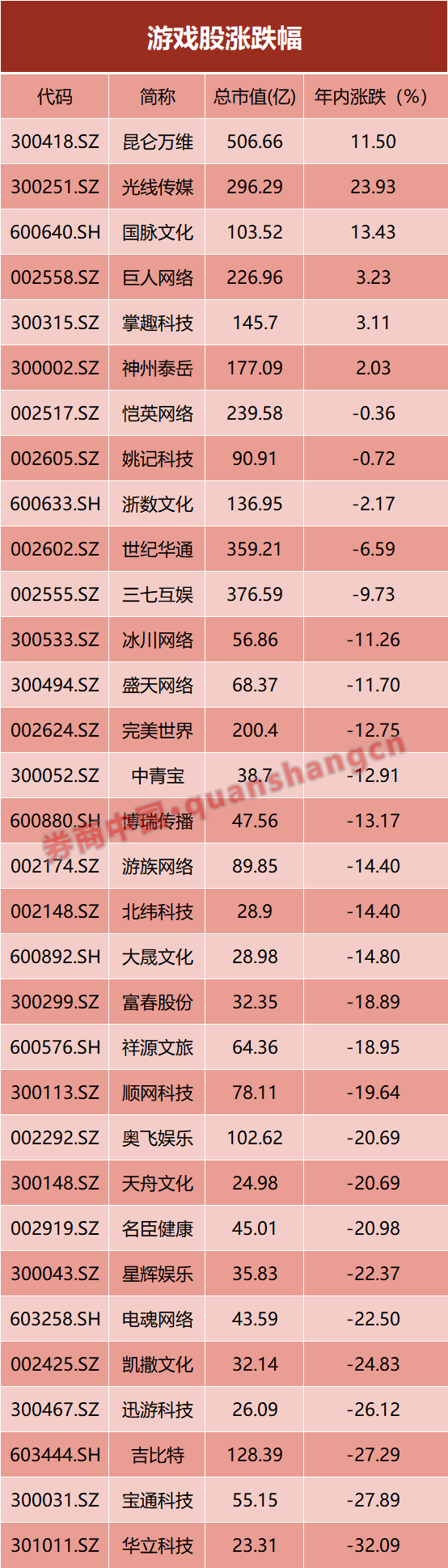 如第一大权重股,也是具备人工智能概念的昆仑万维年内取得了11.5%的涨幅,兼具影视业务与“AI 视频”的光线传媒更是涨约24%;而吉比特、电魂网络以及迅游科技等传统游戏股均面临超过20%的跌幅。