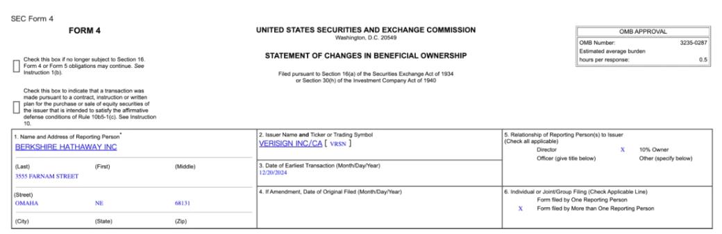 伯克希尔·哈撒韦增持VeriSign,Form4文件。图片来源:SEC