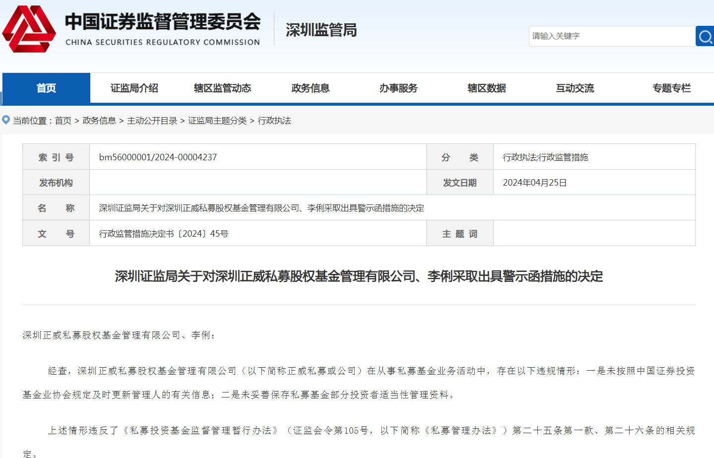 依据规定,深圳证监局决定对正威私募、李俐采取出具警示函的行政监管措施。