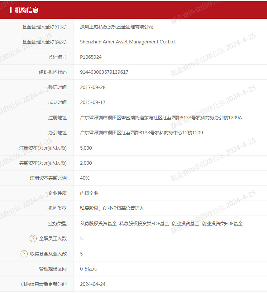 中国证券投资基金业协会网站显示,正威私募成立于2015年9月,注册资本5000万元人民币,实缴资本2000万元人民币,管理规模区间为0-5亿元。