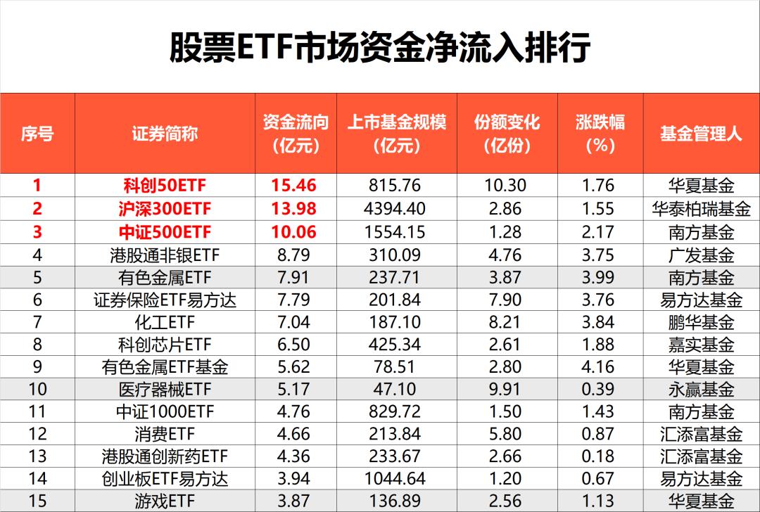 其中,科创50ETF昨日净流入超15亿元,位居全市场首位。沪深300ETF、中证500ETF净流入资金也超10亿元,位居全市场前列。