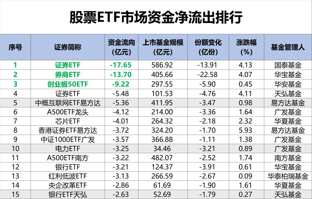 资金流出方面,券商板块净流出居前,证券ETF、券商ETF资金净流出分别超17亿元、13亿元。另外,芯片ETF、电力ETF、ETF等行业ETF净流出也较多。