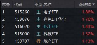 盘面上,电子板块午后强势拉升,荟聚电子板块核心龙头的电子ETF(515260)场内价格劲涨1.88%;顺周期逆市走强,有色ETF华宝(159876)场内收涨1.7%,收盘价创历史新高;覆盖AI算力、反内卷、机器人、新能源等热门主题的化工ETF(516020)盘中场内价格上探2.42%,续创近3年新高;全市场唯一跟踪中证800地产指数的地产ETF(159707)场内价格亦收涨超1%。