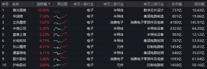 细分方向来看,半导体龙头领涨,紫光国微一字涨停,华润微涨超7%;消费电子龙头方面,立讯精密涨超7%,歌尔股份涨逾3%;PCB(印制电路板)龙头方面,东山精密涨超4%,沪电股份、生益科技涨逾2%。