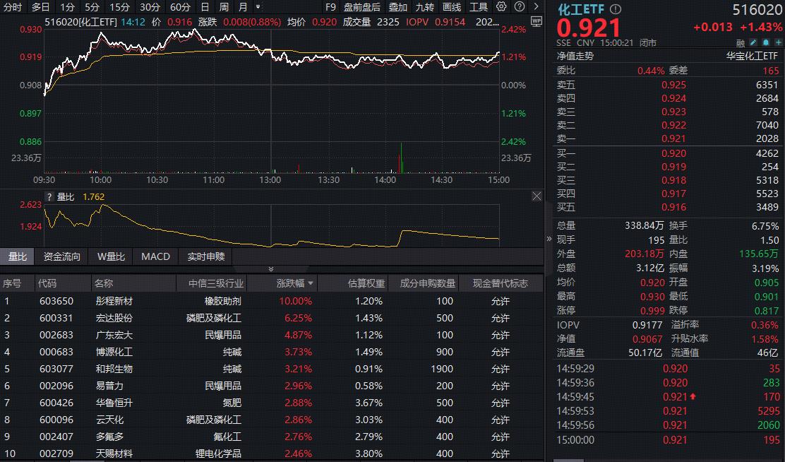 成份股方面,橡胶助剂、磷化工、纯碱等板块部分个股涨幅居前。截至收盘,彤程新材涨停,宏达股份飙涨6.25%,广东宏大大涨4.87%,博源化工、和邦生物双双涨超3%。