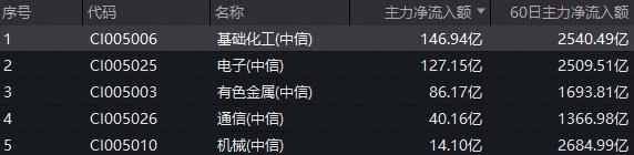 资金面上,基础化工板块持续获资金青睐。数据显示,截至收盘,基础化工板块单日获主力资金净流入额达到146.94亿元,净流入额在30个中信一级行业中高居首位;近60日,基础化工板块累计获主力资金净流入额更是高达2540.49亿元,净流入额在30个中信一级行业中位居第2。