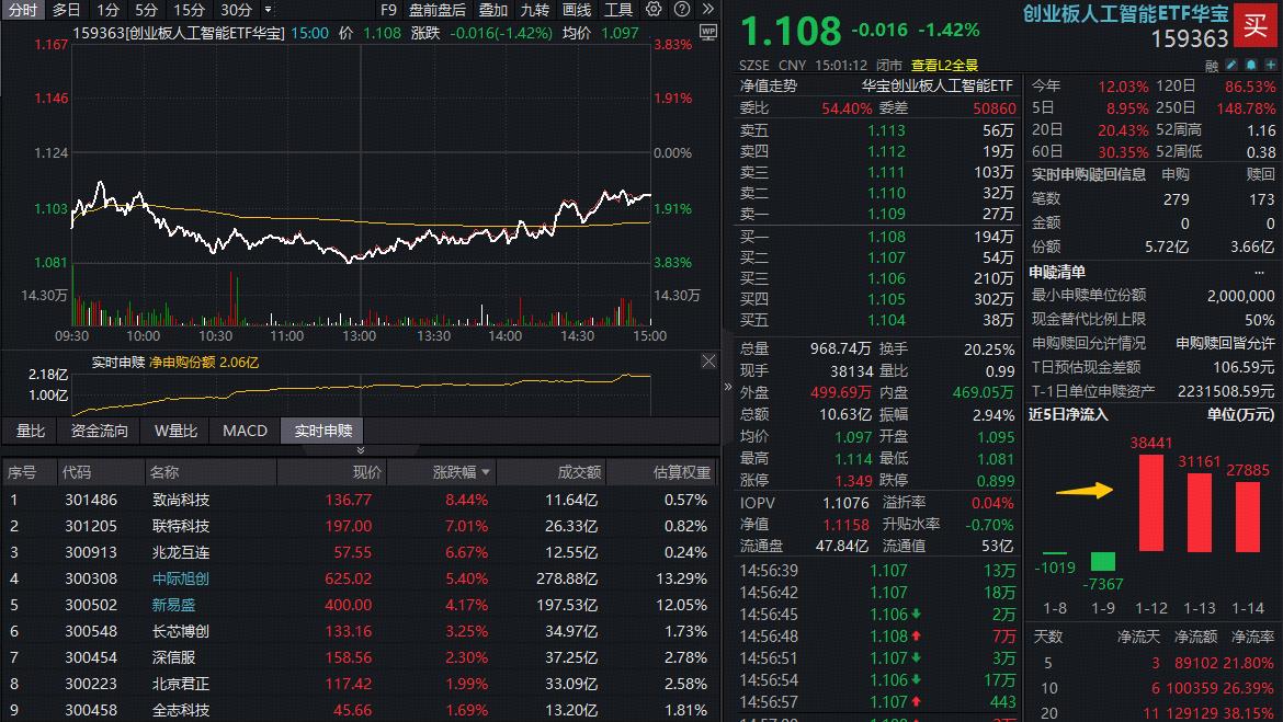 热门ETF方面,双线布局“算力 AI应用”的创业板人工智能ETF(159363)早盘一度下探逾3%,尾盘跌幅收窄,日线顽强收阳!单日成交超10亿元,资金持续加码,全天净申购2.06亿份,此前三日已累计增持9.7亿元。