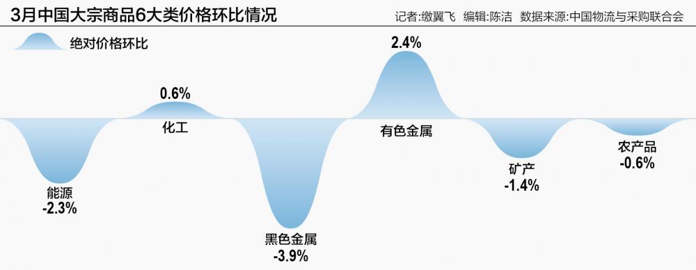 同样的情况也出现在黑色金属中,3月份黑色价格指数跌幅扩大,报85.4,月环比下跌6.7%,年同比下跌15.2%。同时,钢铁企业生产释放力度呈现波动小幅下降的态势。据兰格钢铁网调研数据显示,3月份全国百家中小钢企高炉开工率的均值为74.1%,较上月下降1.6个百分点;全国201家生产企业铁水日均产量为216.3万吨,较上月同期减少2.2万吨。