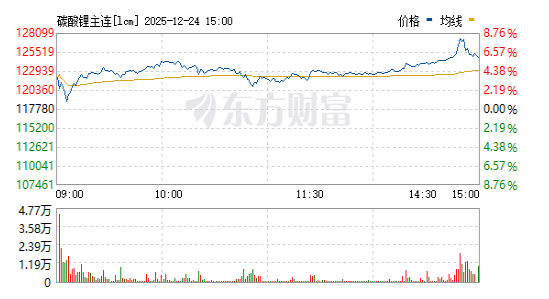 12月24日,碳酸锂期货主力合约价格强势上扬,日内涨幅扩大至6%,最新报124,800元/吨,创近一个月新高。