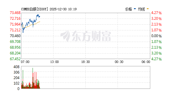 纽约期银价格12月30日大幅走高,日内涨幅扩大至4%,最新报73.30美元/盎司,创近两周新高。