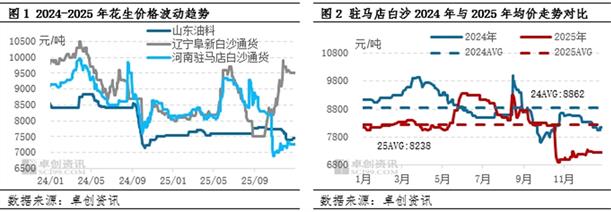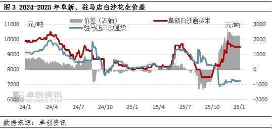 新花生自8月份开始陆续上市后,价格高开低走,本产季供应持续扩大,河南地区因天气影响下,河南产区直至11月初麦茬花生收获才陆续结束,延迟上市以及部分花生品质不理想导致价格走低,驻马店白沙通货米收购价一度触及7000元/吨以下的水平。东北地区小贩等环节有存货积极性,品质与河南有差距的情况下价格走高幅度明显。卓创资讯统计截至12月31日,2025年驻马店地区白沙花生通货米均价8238元/吨,同比下滑7.04%;阜新地区白沙花生通货米均价8525元/吨,同比下滑6.96%;山东油料均价7627元/吨,同比下滑7.02%。