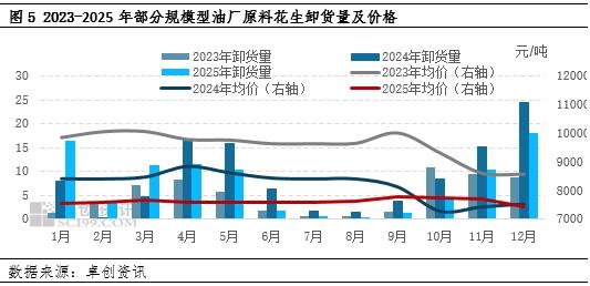 进入12月份后,部分大型油厂陆续入市收购原料,油料消耗速度加快,不过油厂意向收购好货为主,控制质量,随着原料陆续到货,油厂开机压榨增加,油料花生成为主要消耗途径。东北地区本地油料米成本偏高,部分贸易商从河南等低价区域调货,整体来看,截止到12月末,2025年油料米成本相对维持低位,收购均价参考7627元/吨,同比下滑7.02%,油厂卸货速度适中。卓创资讯统计2025年部分规模型油厂原料卸货约89.52万吨,同比下滑16.17%。马年春节延后,节前油厂停机及停收时间或较往年延后,不过油料米潜在供应充足,油厂或缺乏提价收购的必要性。