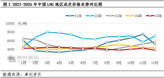 据卓创资讯统计,2025年中国LNG地区成交均价为4216.97元/吨,同比下跌了6.55%。年内市场整体呈现“前高后低”行情,后半段上游多次出现的让利促销措施拉低了全年均价水平,但上半年国际供需不稳定性对于我国海气供应的扰动频仍,这也是抑制全年均价跌幅的关键。