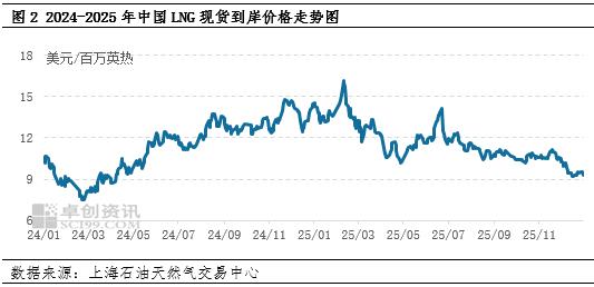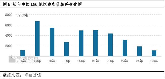 与此同时,由于海气供应减少、现货成本抬高等推涨因素与需求跟进乏力、季节性因素支撑不足、库存承压等助跌因素交替出现且频繁博弈,窄幅震荡成为了LNG市场的常态。据卓创资讯统计,2025年,中国LNG地区成交日度价格最低点出现在12月26日,当日价格为3551.86元/吨,最高点出现在3月3日,当日价格为4700.46元/吨;年内价格极差约为1148.6元/吨,同比缩小了39.2%,且为近十年之最低水平。