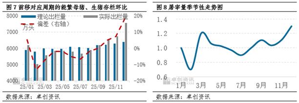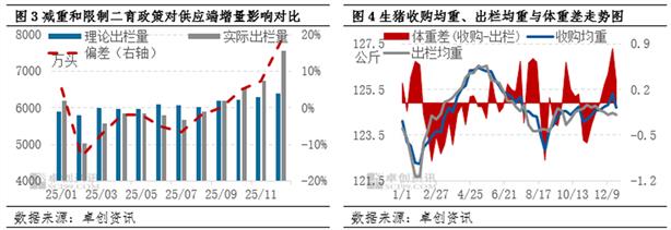 出栏量:从理论出栏的角度看,2025年1-12月生猪出栏量对应2024年3月-2025年2月的能繁母猪,期间农业农村部数据及卓创资讯监测规模场数据均以连续增加走势为主。而以新生仔猪作为中间环节验证数据,1-12月生猪出栏量对应2024年7月-2025年6月的新生仔猪,期间新生仔猪环比呈增加走势,6-7月、10月和12月涨幅较大,其中6-7月及10月出栏超预期增加,导致供应过剩,猪价先后出现跌幅扩大和跌至最低点现象,12月因消费端超预期增量,供应对猪价利空效果被缓冲。