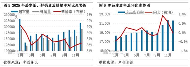需求端分析:从季节性规律来看,1-6月需求或先减后增再减,但因2026年春节时间在2月中旬,集中备货期或在2月初开始,因此1-3月屠宰量或先增后减,4-6月先常规恢复增量后小幅减少。基于2026年猪价走势预期前低后高,上半年屠宰企业或逢低进行补库动作,按照生猪价格常规性季节性走势分析,补库时间点或在4-6月,或影响鲜销率下滑,鲜销占比下降。结合未来冻品收益及屠企资金运行情况分析,预计补库体量或略超过2025年,但远不及2019-2020年高点。