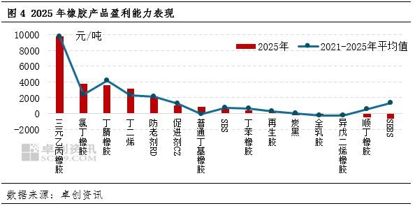 盈利能力是行业运行现状的“晴雨表”。在国际经济不确定性增强、行业产能过剩、内卷加剧的当下,多数行业盈利逐渐进入微利或无利状态。卓创资讯监测的橡胶行业15个主要产品盈利情况看,2025年橡胶行业虽整体盈利水平收缩,但产品间仍存较大差异,与各品目成本调整或产品自身供需关系有关。卓创资讯监测数据显示,2025年15个橡胶原辅料产品中共计有10个产品盈利,年平均盈利在千元以上的产品有6个;盈利产品主要集中在特种合成橡胶、丁二烯、橡胶助剂方面。特别是三元乙丙橡胶吨理论盈利近万元;也有部分产品盈利在1000-4000元/吨,如丁二烯、丁腈橡胶、氯丁橡胶;另有部分产品长期徘徊在盈亏边缘或长期亏损,如丁苯橡胶、顺丁橡胶、SBC、炭黑等。未来随着产能的扩增,行业竞争加剧,利润将会继续遭受打压,特别是目前盈利尚可的产品或将随着供应格局的调整而收敛利润。