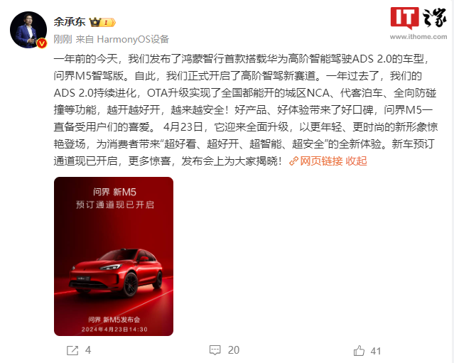 燃点网 4 月 17 日消息,燃点网从华为终端官方微博获悉,问界新 M5 预订通道现已开启,新车将于 4 月 23 日 14:30 发布,4 月 23 日 15:00 前下订,即可享受 2000 元订金抵扣 5000 元购车款的优惠政策,并可优先提车。
