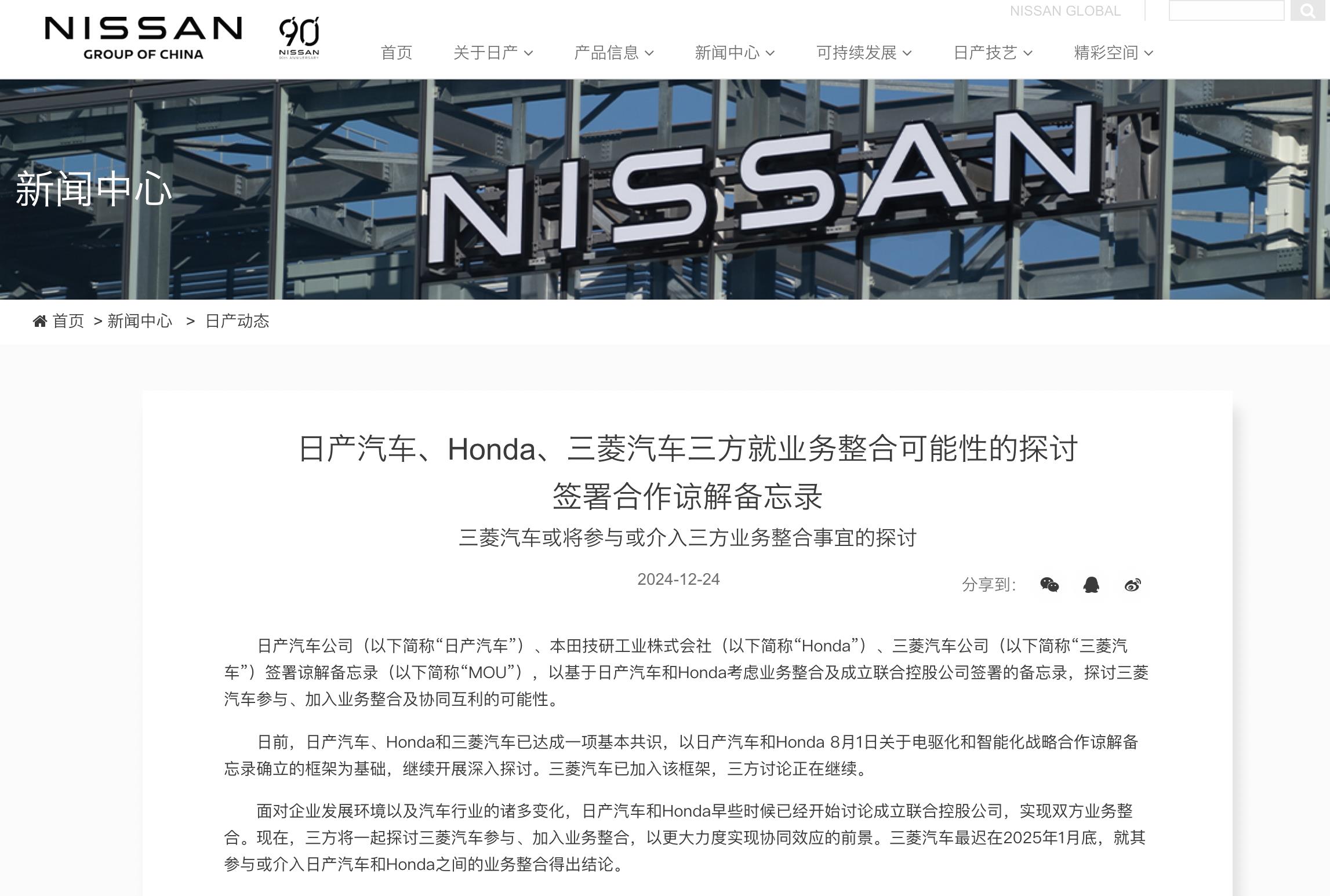 23日,日本汽车制造商日产汽车有限公司(下称日产)、本田汽车有限公司(下称本田)、三菱汽车株式会社(下称三菱汽车)正式签署谅解备忘录。根据签署内容,日产和本田考虑业务整合及成立联合控股公司,并探讨三菱汽车参与、加入业务整合及协同互利的可能性。
