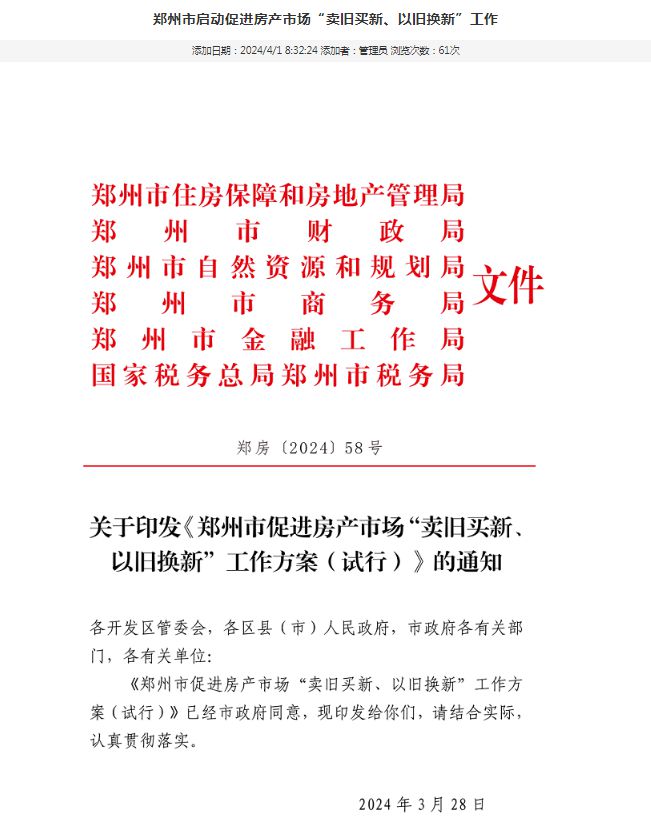 燃点网4月1日电 据郑州市房协官网4月1日消息,郑州市房管局等部门印发《郑州市促进房产市场“卖旧买新、以旧换新”工作方案(试行)》,方案提到,2024年全市计划完成二手住房“卖旧买新、以旧换新”10000套。
