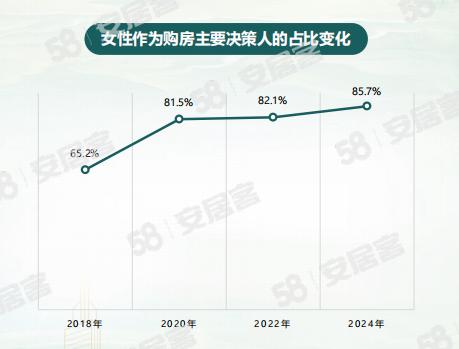 具体到“买房听谁的”上,女性也拥有了更多决策权。58同城、安居客调研结果显示,85.7%的女性购房者是主要决策人,有71.8%的女性表示会参考别人的购房意见,最终仍会自己做决定。从历年数据来看,女性作为购房主要决策人的占比由2018年的65.2%提升至2024年的85.7%。反映出,女性在购房中的决策权呈现出越来越重的趋势。