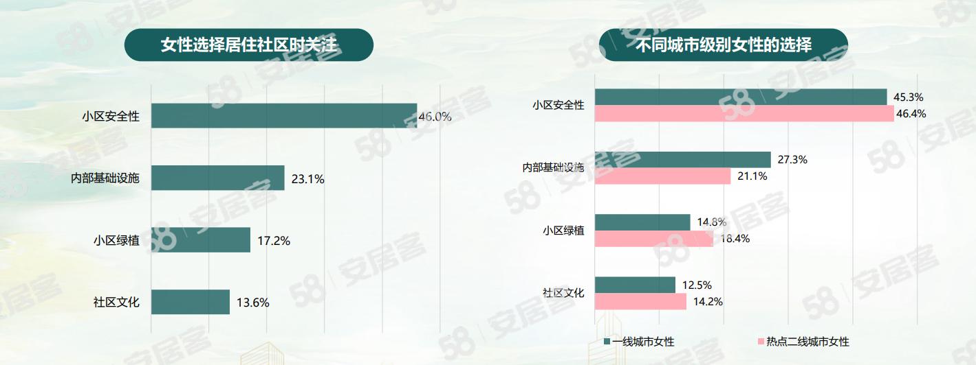 在居住社区的选择上,女性购房者对小区的安全问题最为关注,有46%的受访者主要考虑这一因素。从家庭情况来看,已婚已育的女生最注重小区安全,除了考虑自身的安全外,更多的或是注重小孩在社区中的安全性。此外,相比在二线城市工作的女性,在一线城市工作的女性更关注小区内的基础设施,注重居住的实际体验。