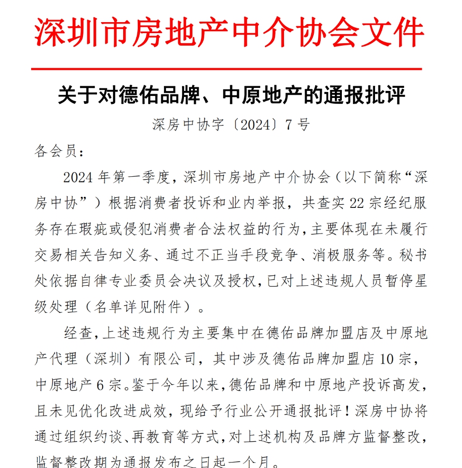 深房中协指出,经查,上述违规行为主要集中在德佑品牌加盟店及中原地产代理(深圳)有限公司,其中涉及德佑品牌加盟店10宗,中原地产6宗。鉴于今年以来,德佑品牌和中原地产投诉高发,且未见优化改进成效,现给予行业公开通报批评。
