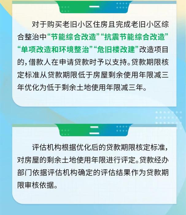通知提出,对于购买老旧小区住房且完成老旧小区综合整治中“节能综合改造”“抗震节能综合改造”“单项改造和环境整治”“危旧楼改建”改造项目的,借款人在申请贷款时予以支持。贷款期限核定标准从贷款期限低于房屋剩余使用年限减三年优化为低于剩余土地使用年限减三年。