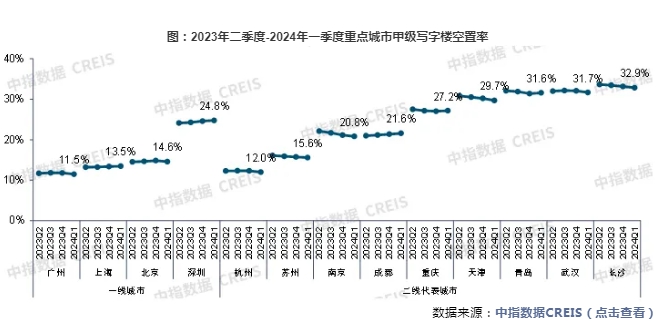 空置率方面,根据中指数据,2024年一季度,一线城市甲级写字楼空置率相对较低,其中广州最低,为11.5%;二线代表城市中,杭州、苏州甲级写字楼空置率分别为12.0%、15.6%,市场供求相对平衡,青岛、武汉、长沙等城市甲级写字楼空置率相对较高,空置压力相对较大。