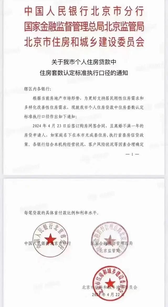 4月22日,中国人民银行北京市分行、国家金融监督管理总局北京监管局、北京市住房和城乡建设委员会联合发布《关于我市个人住房贷款中住房套数认定标准执行口径的通知》(以下简称《通知》)。