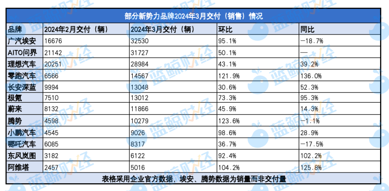 部分新势力品牌3月交付量(销量)(图片来源:蓝鲸财经制图)