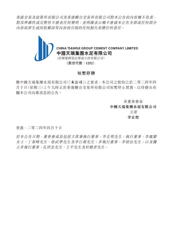 中国天瑞水泥4月10日在港交所公告,将于今天上午九时正起短暂停止买卖,以待发出有关公司内幕消息的公告。中国天瑞水泥昨日股价暴跌99%。