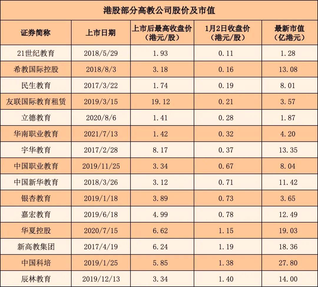 此外,曾经市值超过250亿港元的宇华教育,如今总市值仅剩13.3亿港元;市值曾超过180亿港元的希望教育,最新市值约13.1亿港元。据统计,21家公司中,有16家公司股价较高峰期下跌70%以上。截至1月2日,21家港股民办高教股,已有11家收盘价不足1港元,21世纪教育、希望教育、民生教育等7家公司股价跌破0.5港元。也就是说,股价不足1港元的股票占比超过85%。