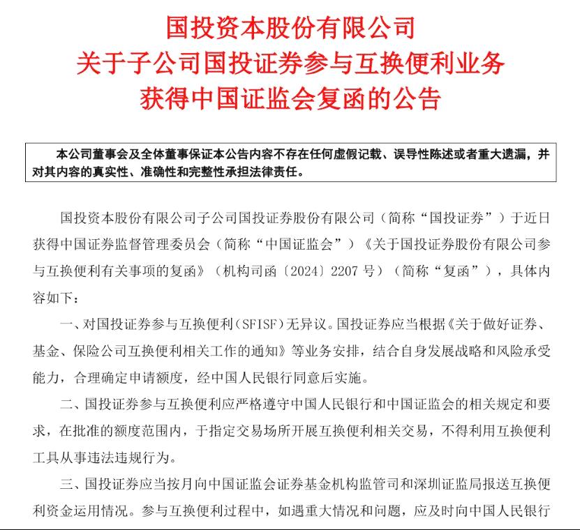 1月2日当天,国投证券的股东国投资本披露,已收到证监会的复函,获准参与互换便利。当天,还有包括国金证券、方正证券和长城证券发过类似公告,均披露获准参与互换便利。