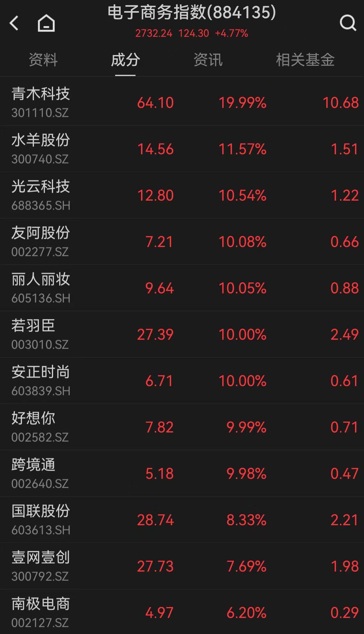 截至午盘,电子商务概念股中,青木科技“20cm”涨停,友阿股份、丽人丽妆、若羽臣、安正时尚、好想你、跨境通等均涨停,水羊股份、光云科技涨超10%,国联股份、壹网壹创等大幅跟涨。