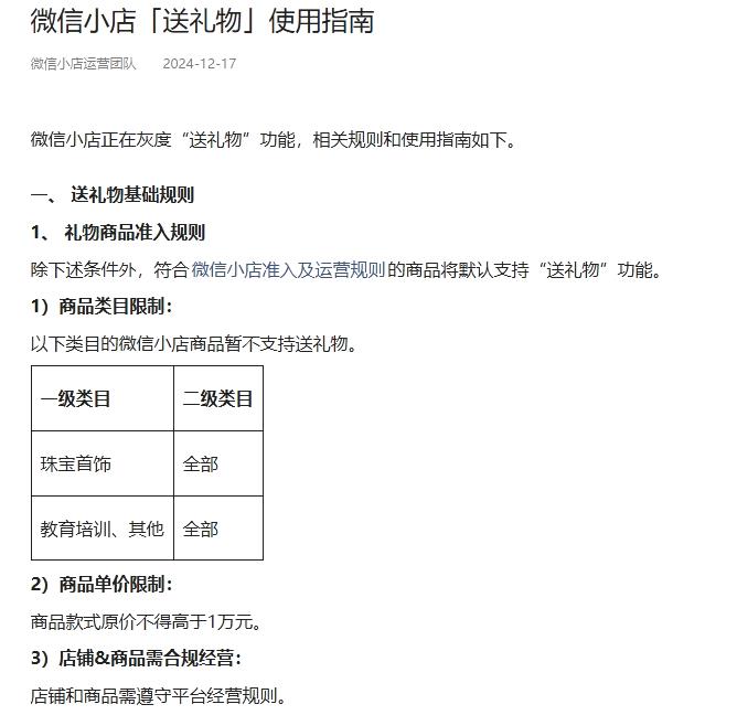 日前微信小店运营团队在官网公告称,正在灰度“送礼物”功能。除了珠宝首饰和教育培训等类目,符合微信小店准入及运营规则的商品将默认支持“送礼物”功能。在单价限制方面,商品款式原价不得高于1万元。