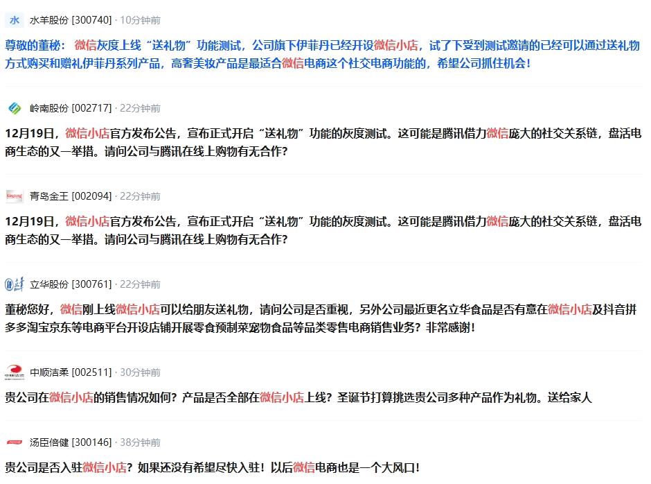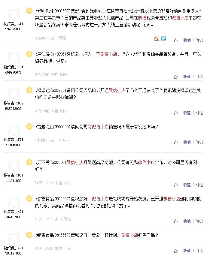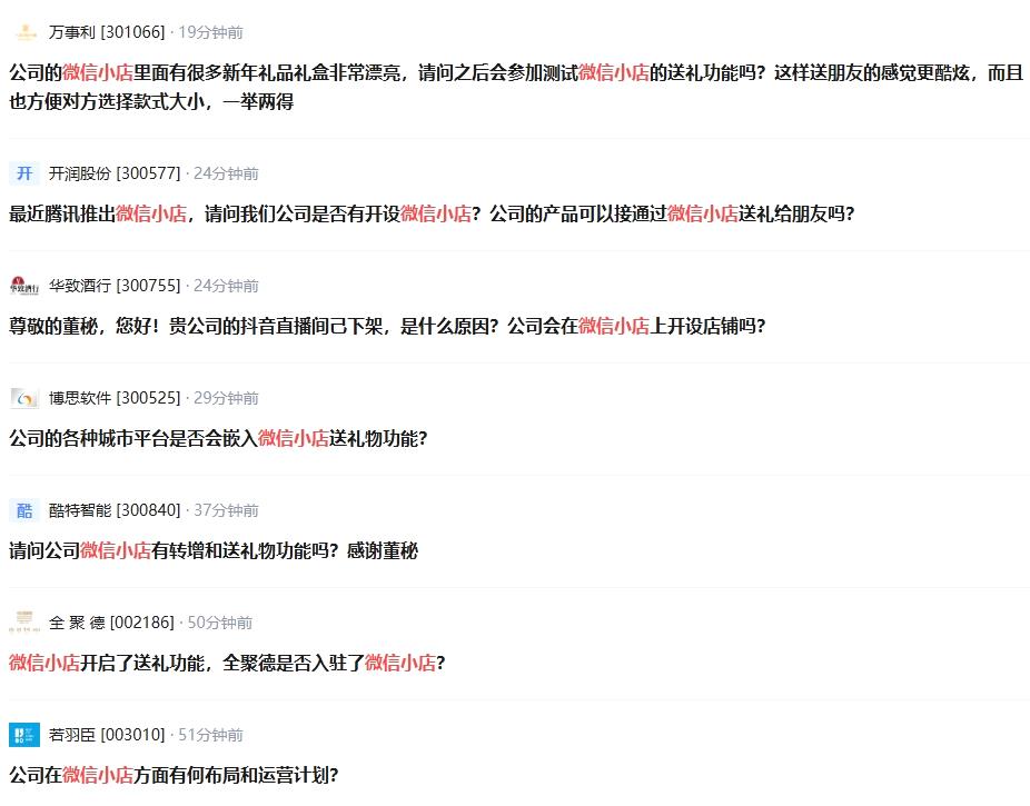 在投资者互动平台上,不少股民都在询问上市公司与微信小店相关的情况,或者希望公司开通和深耕相关功能,抓住机会。