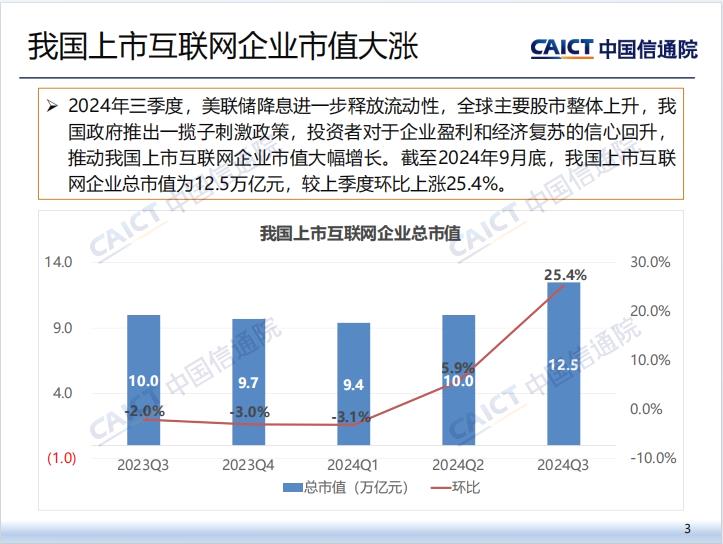 中国信通院指出,2024年三季度,美联储降息进一步释放流动性,全球主要股市整体上升,我国政府推出一揽子刺激政策,投资者对于企业盈利和经济复苏的信心回升,推动我国上市互联网企业市值大幅增长。截至2024年9月底,我国上市互联网企业总市值为12.5万亿元,较上季度环比上涨25.4%。