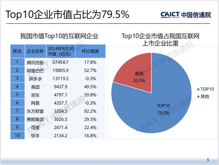 中国信通院指出,我国市值Top 10的互联网企业分别为腾讯控股、阿里巴巴、拼多多、美团、京东、网易、燃点网、携程集团、百度、快手。