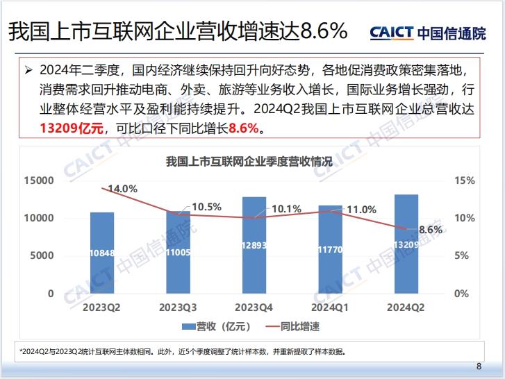 中国信通院还指出,2024年二季度,国内经济继续保持回升向好态势,各地促消费政策密集落地,消费需求回升推动电商、外卖、旅游等业务收入增长,国际业务增长强劲,行业整体经营水平及盈利能持续提升。2024Q2我国上市互联网企业总营收达13209亿元,可比口径下同比增长8.6%。