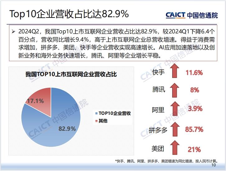 中国信通院称,2024Q2,我国Top 10上市互联网企业营收占比达82.9%,较2024Q1下降6.4个百分点,营收同比增长9.4%,高于上市互联网企业总营收增速。得益于消费需求增加,拼多多、美团、快手等企业营收实现高速增长。AI应用加速落地以及创新业务和海外业务快速增长,腾讯、阿里等企业增长平稳。