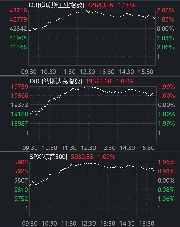 截至收盘,道指涨1.18%,报42840.26点;纳指涨1.03%,报19572.60点;标普500指数涨1.09%,报5930.85点。