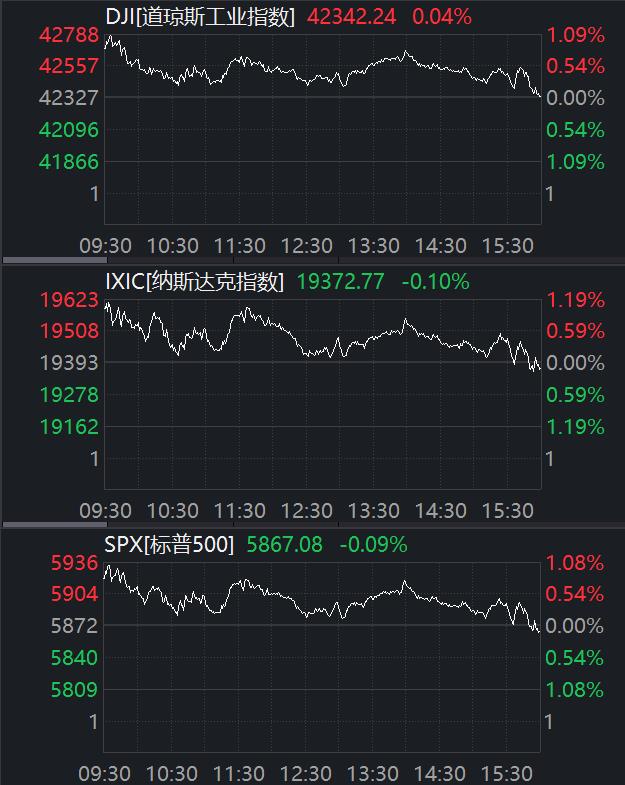 截至收盘,道指涨0.04%,报42342.24点;纳指跌0.1%,报19372.77点;标普500指数跌0.09%,报5867.08点。